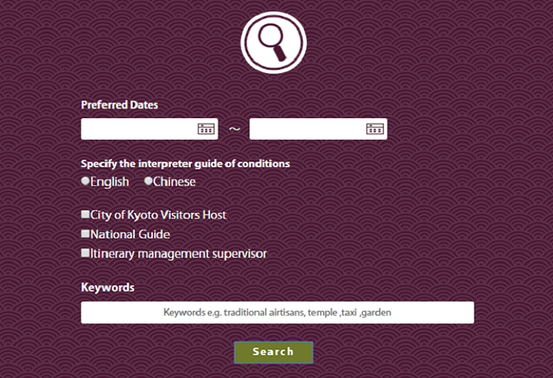 The City of Kyoto Visitors Hosts search site, Clematis, allows visitors to search for interpreter guides who specialize in Kyoto and Kyoto-quality service, and functions as a messaging system for submitting inquiries to desired guides.